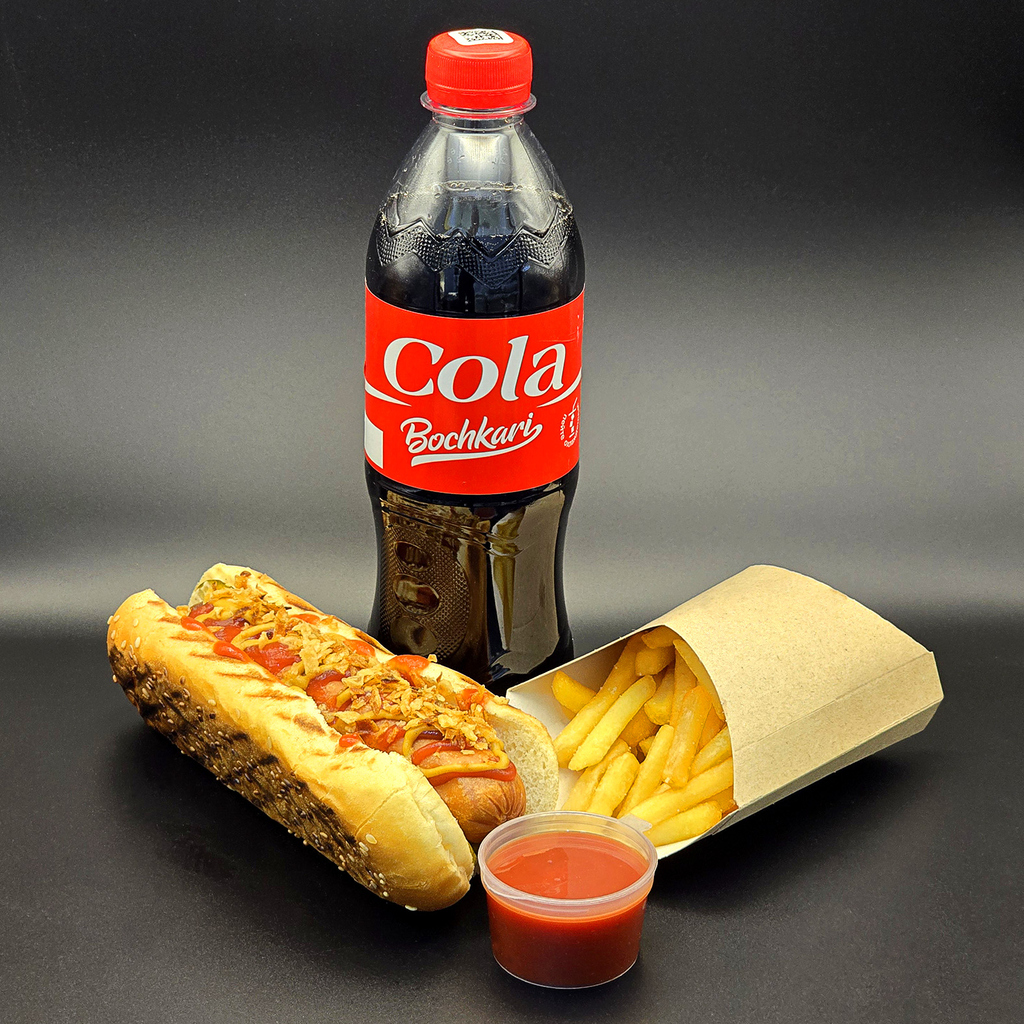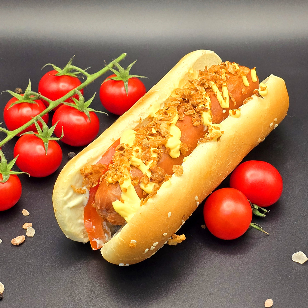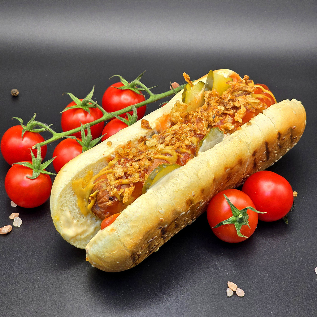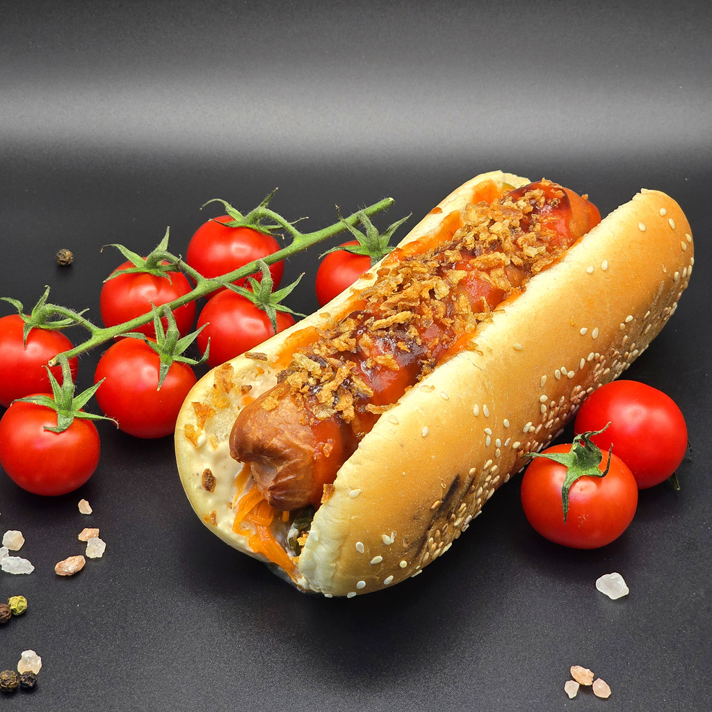 Булочка, сосиска, соус на выбор, морковь по-корейски, соус шрирача, перец халапеньо, лук фри, соус BBQ