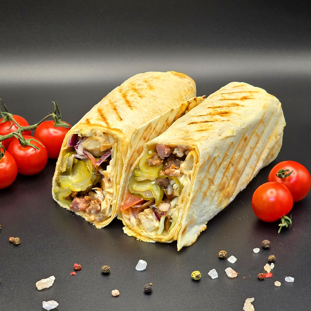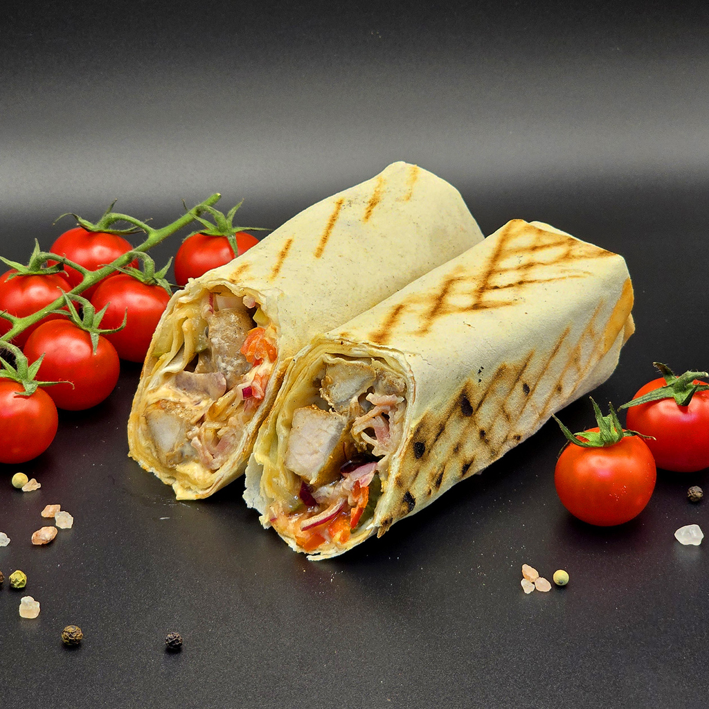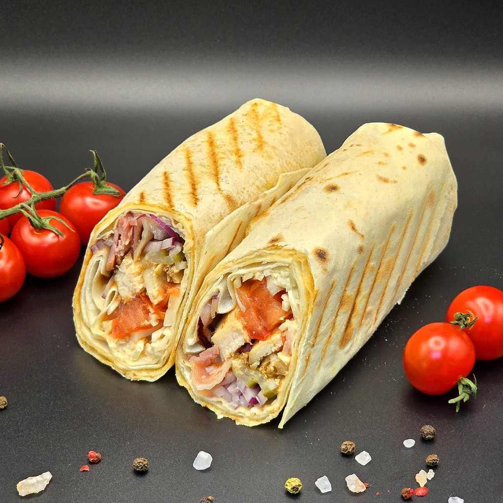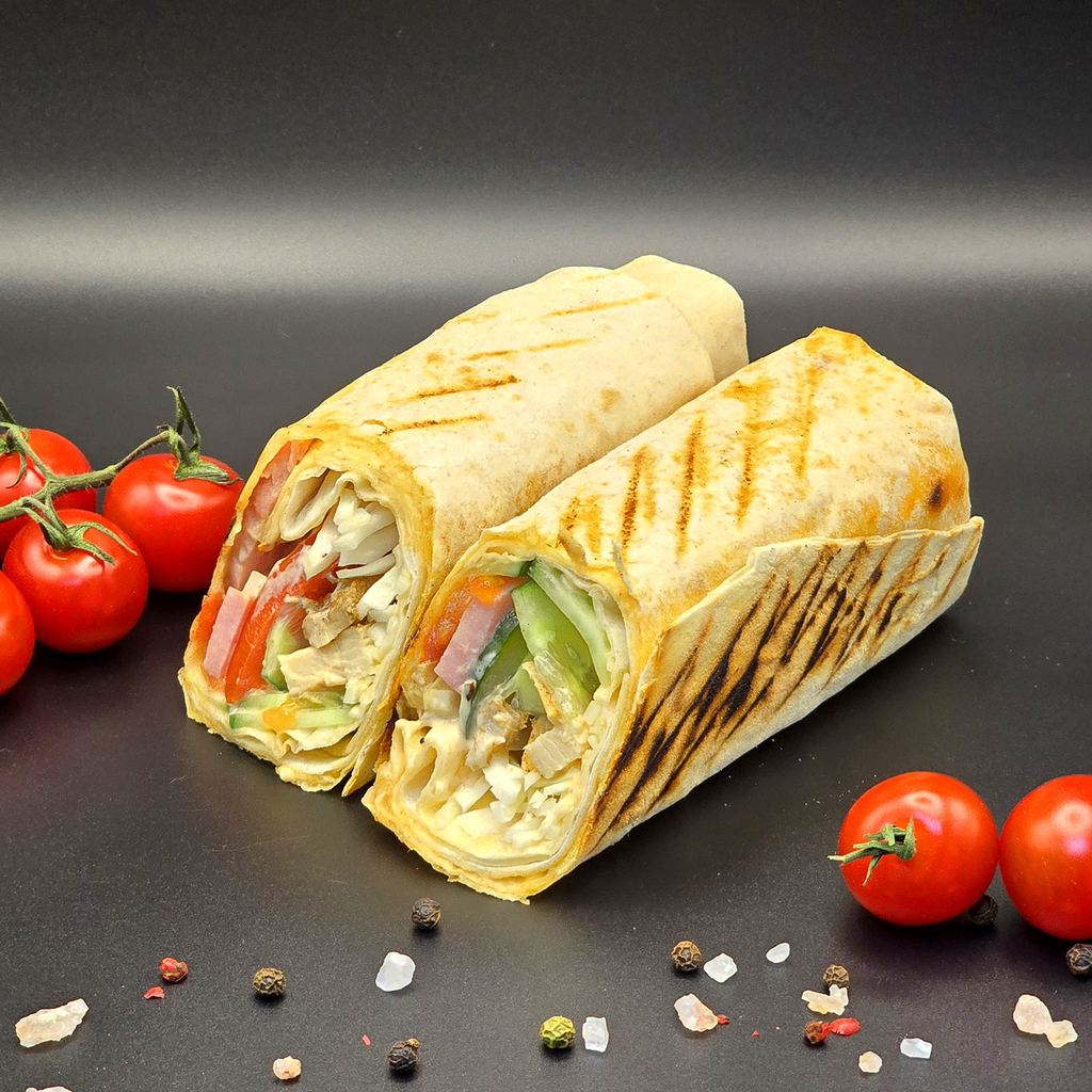 Шаурма ТипТоп: курочка, ветчина, соус на выбор, капуста, огурец свежий, томаты свежие
